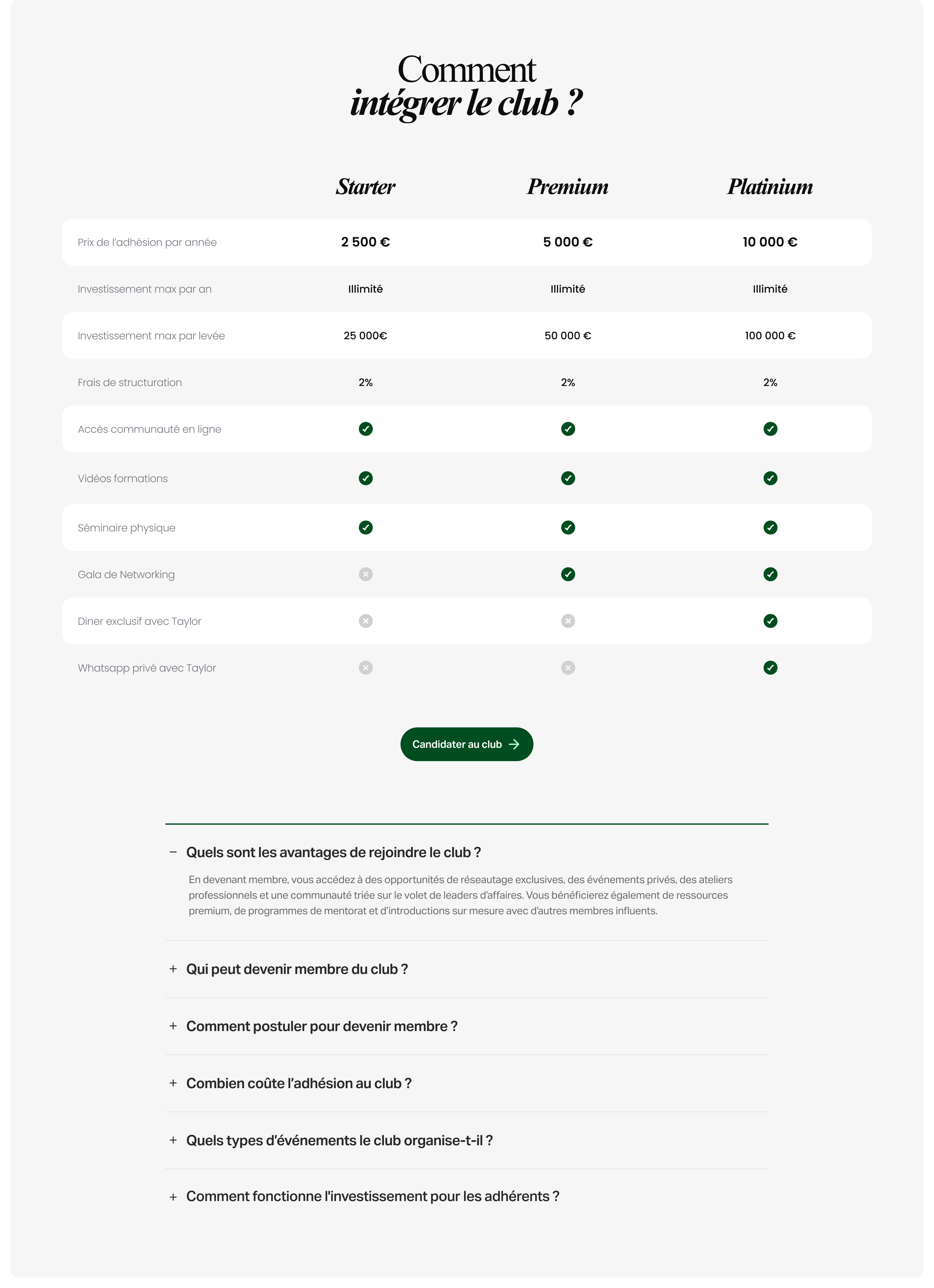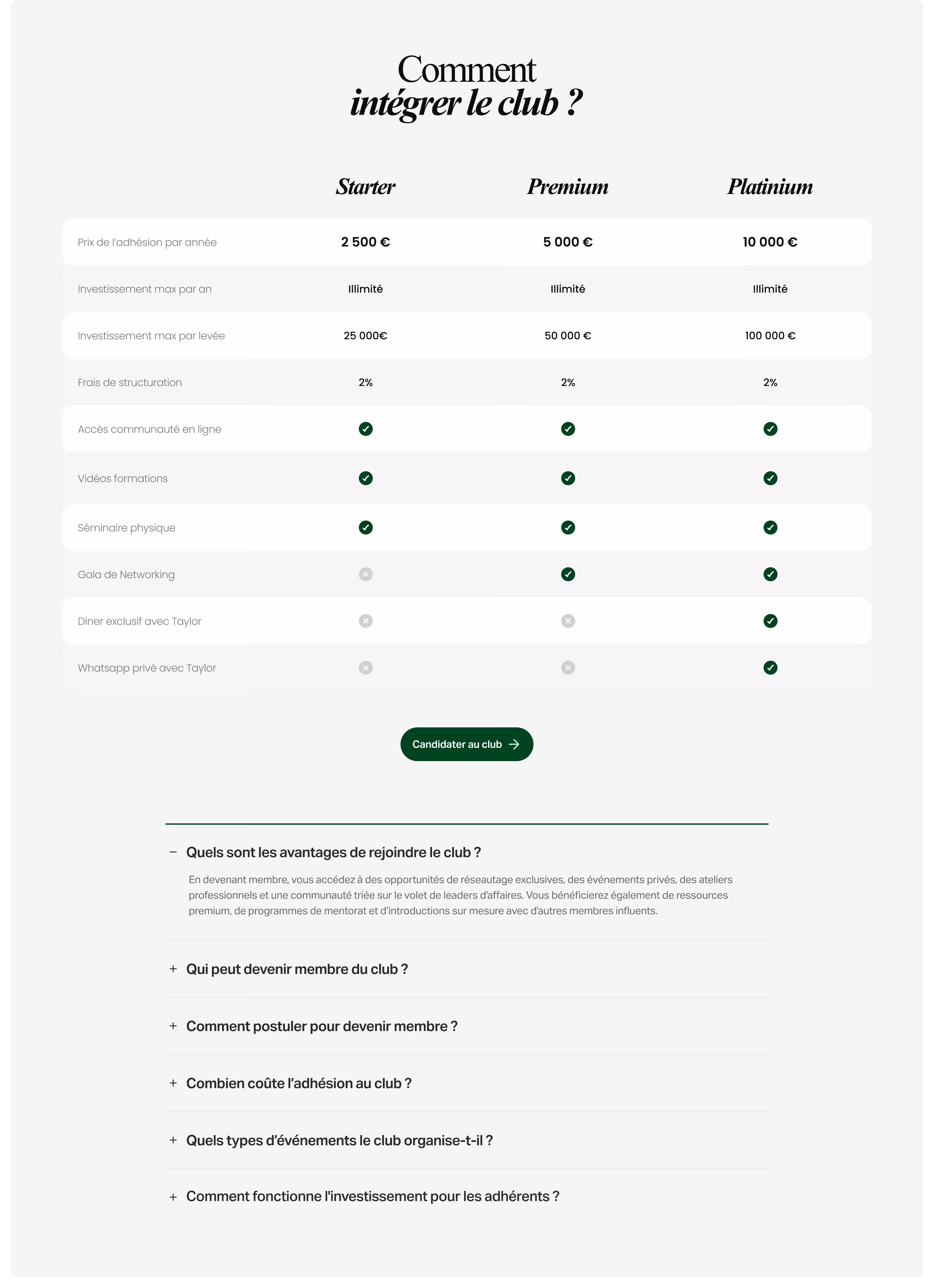 The creation of the site had to meet several challenges. First we had to highlight Taylor Chiche's personal branding, while avoiding falling into an approach that is too focused on the person at the expense of the product. The site then had to structure an offer that combines content, community and investment, with a clear and accessible discourse. The conversion dimension was also central, with the need to guide the user to join the club via a simple and fluid process. Finally, the site needed to incorporate solid SEO bases to capture an audience interested in investment, personal finance and private clubs.