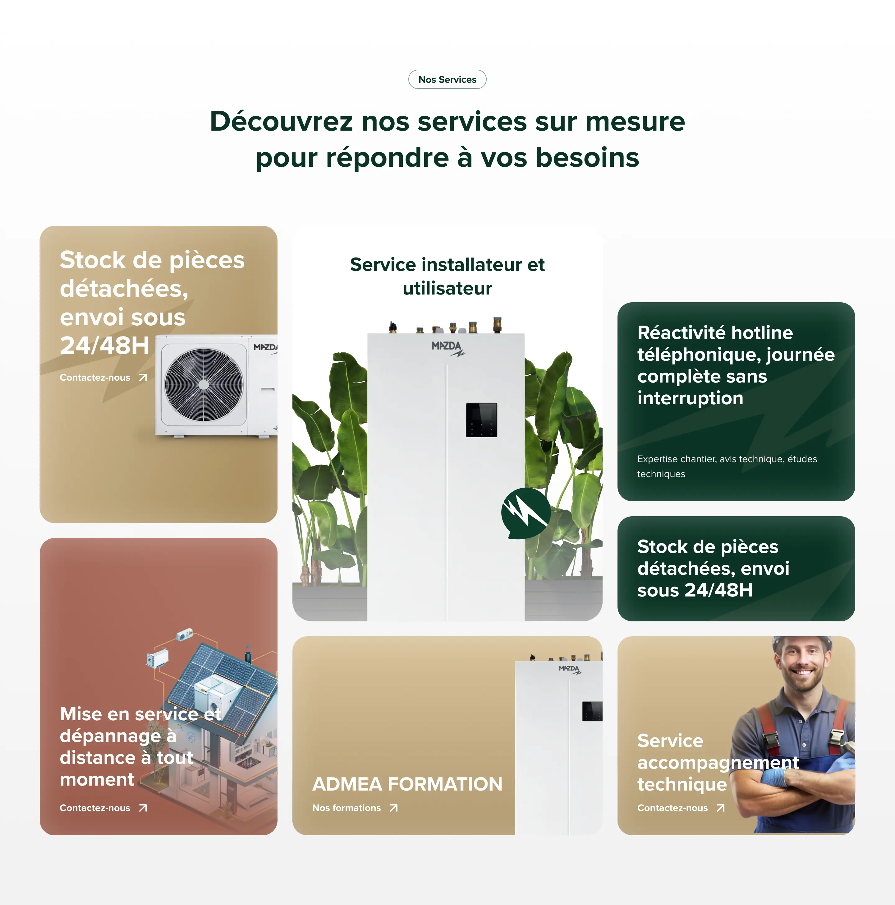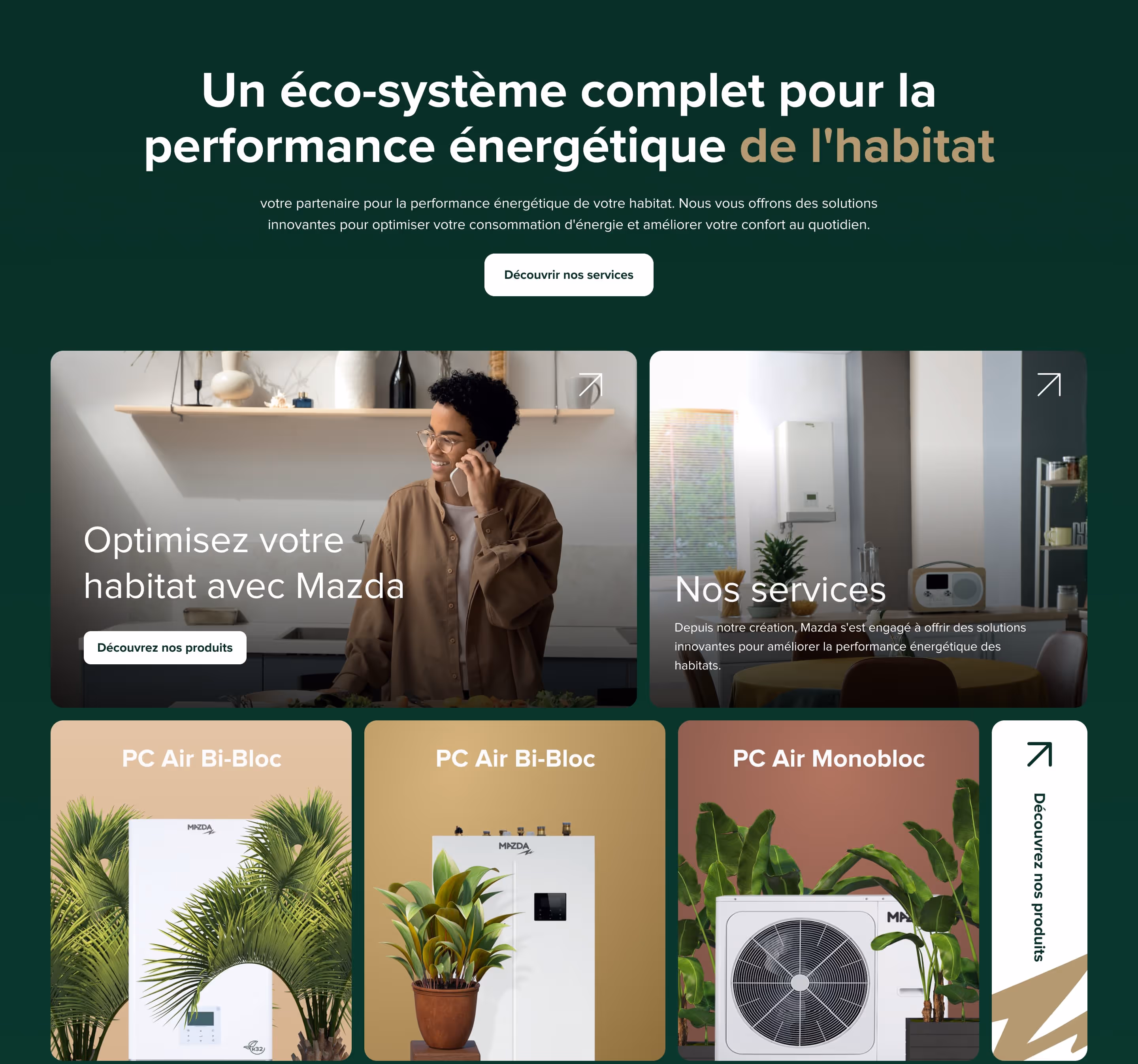 The creation of the site had to meet several challenges. First, it was a question of designing a simple, professional and reassuring artistic direction, in line with the positioning of Mazda Énergie. Next, we had to structure each page according to a clear conversion logic, by simplifying the messages, by prioritizing the benefits produced, and by multiplying the points of contact without being intrusive. Finally, the presentation of the various product ranges (solar panels, inverters, batteries) had to be both technical and accessible, to allow any type of visitor — expert or not — to understand the advantages of each solution.