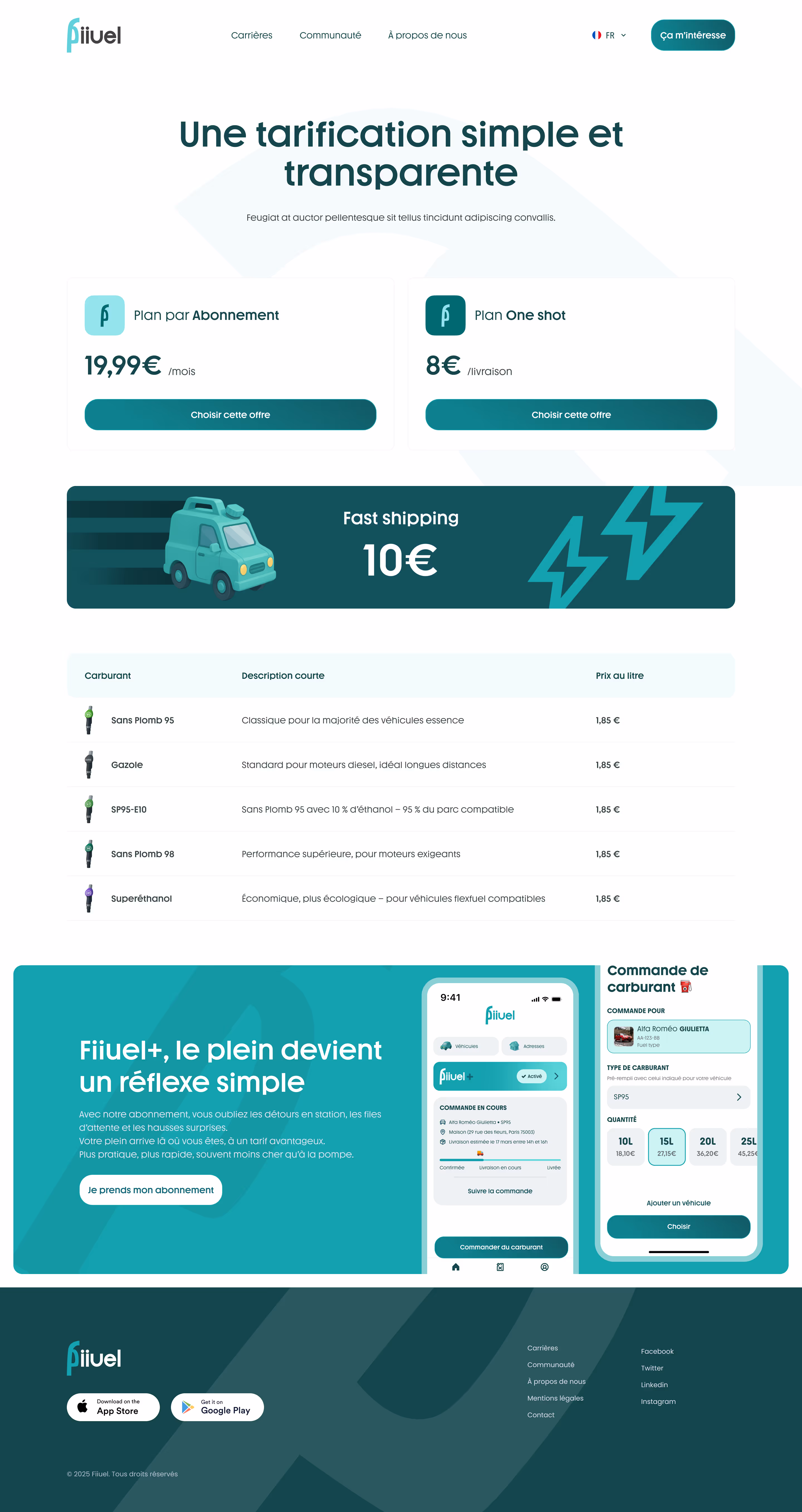 Fiiuel s’adresse à une cible large, allant des particuliers souhaitant faire le plein sans se déplacer, aux professionnels de la logistique ou du BTP ayant besoin d’un approvisionnement régulier sur site. Le besoin était clair : créer une vitrine web qui valorise la simplicité du service, la rapidité d’intervention, et le positionnement local. Le service étant nouveau, il fallait à la fois construire de la notoriété, rassurer sur la sécurité et la fiabilité, et inciter à tester. Le site devait donc être à la fois pédagogique, vendeur et structuré pour convertir efficacement sur des pages simples, avec un formulaire de commande ou de contact accessible en permanence.